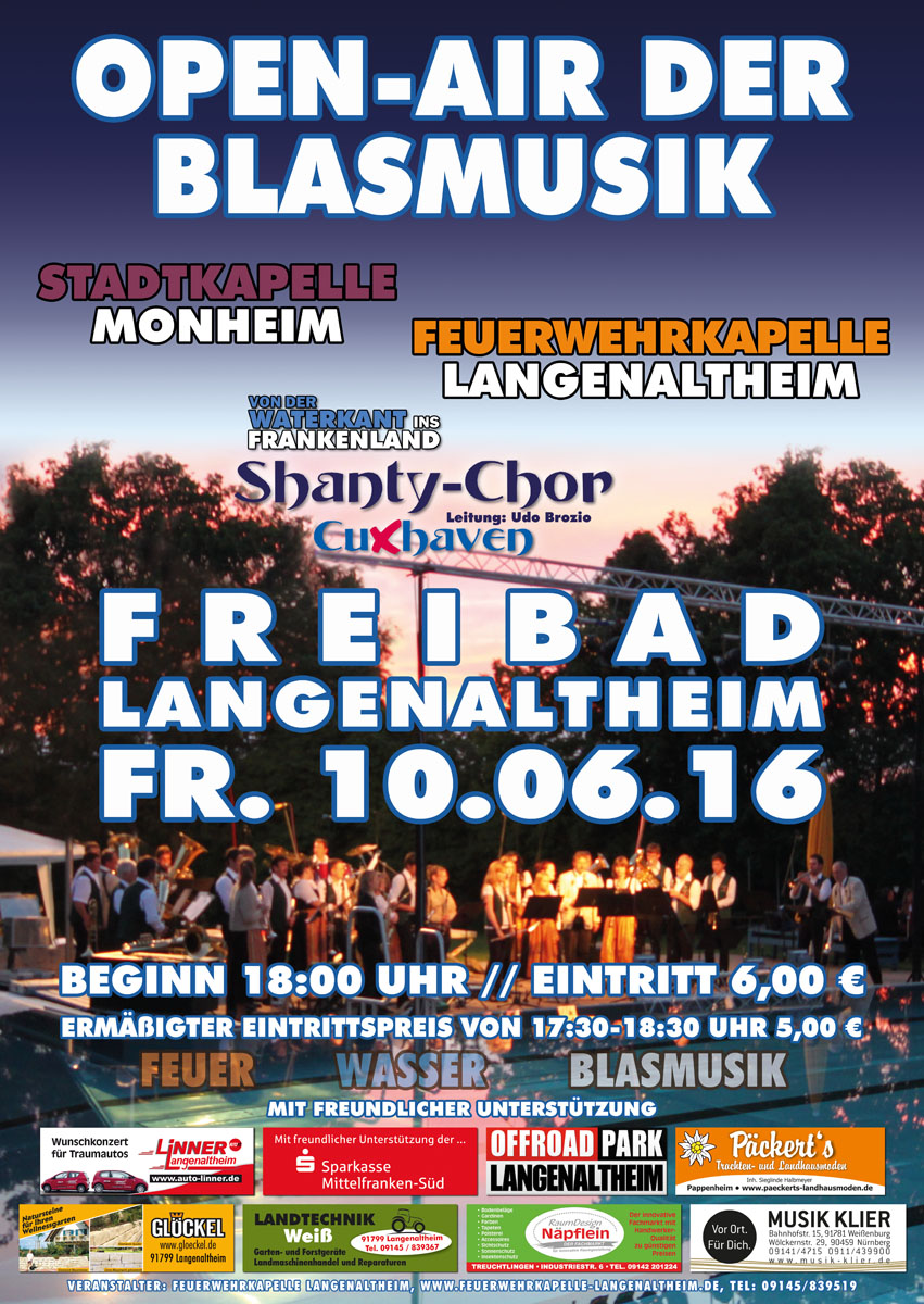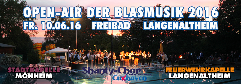 Am 10. Juni 2016 findet unser drittes Open-Air der Blasmusik im Freibad Langenaltheim statt. Zusammen mit der unseren Freunden der Stadtkapelle Monheim werden wir wieder das Beste der Blasmusik darbieten.