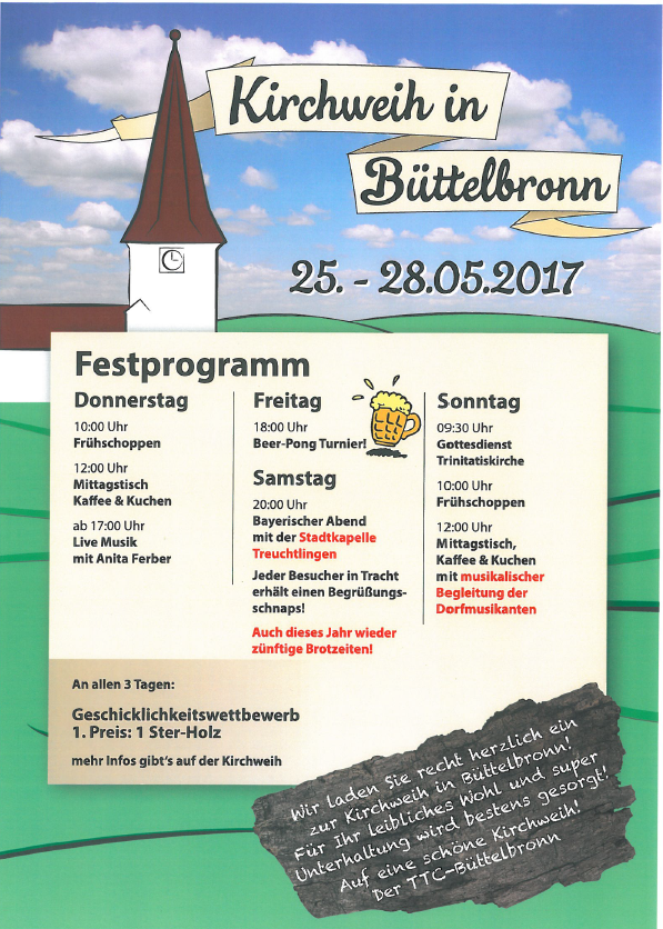 Der TTC Büttelbronn läd wieder zur Kirchweih ein!!! Dateien SSPZ - Lohn17051815040.pdf 503,31 kB – 304 Downloads Zitieren Inhalt melden Termin exportieren