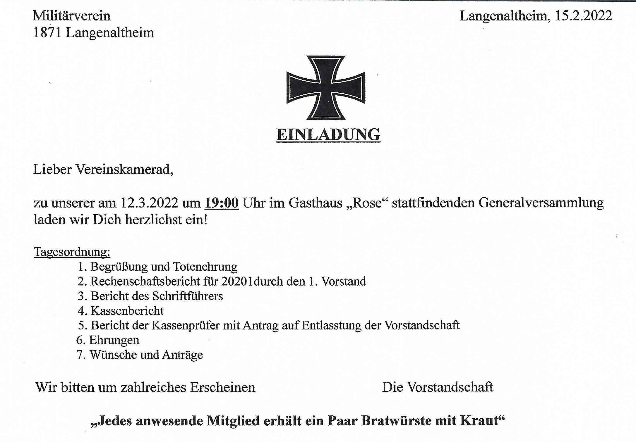 Militärverein Generalversammlung im Gasthof Rose - Jedes Mitglied erhält 1 Paar Bratwürste mit Kraut kostenlos vom Verein. Zitieren Inhalt melden Termin exportieren