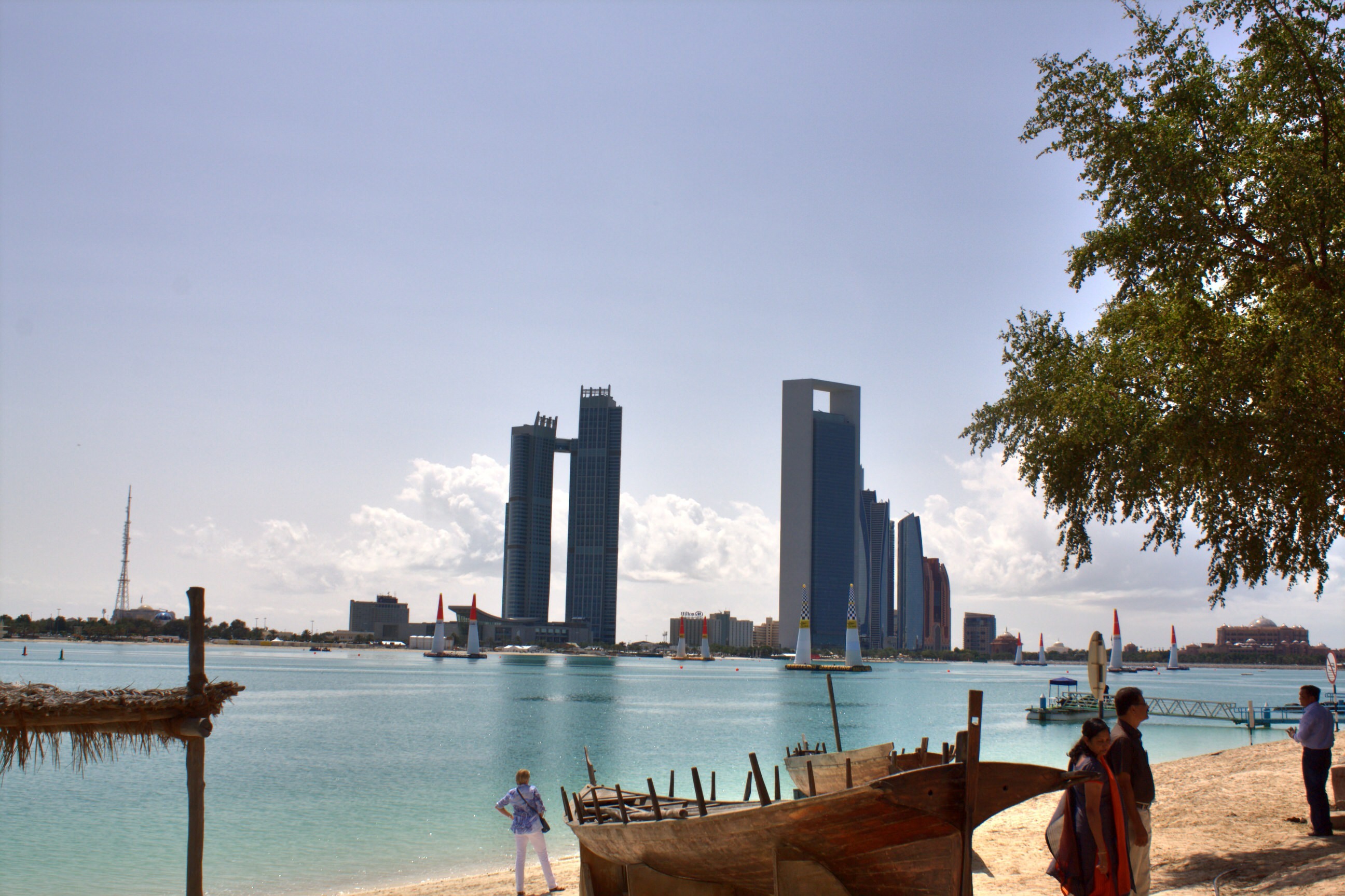 Der Kern der Stadt mit ihren 621.000 Einwohnern befindet sich auf einer 70 Quadratkilometer großen Insel im Persischen Golf, im Mangrovengürtel. Mit dem Festland verbunden ist sie durch die Mussafa-Brücke, die al-Maqtaa-Brücke und die Sheikh-Zayed-Brücke. Die Hauptinsel ist von einem Kranz künstlich erweiterter oder neu aufgespülter Inseln umgeben, die zurzeit erst zum Teil bebaut sind und das Siedlungsgebiet erweitern.