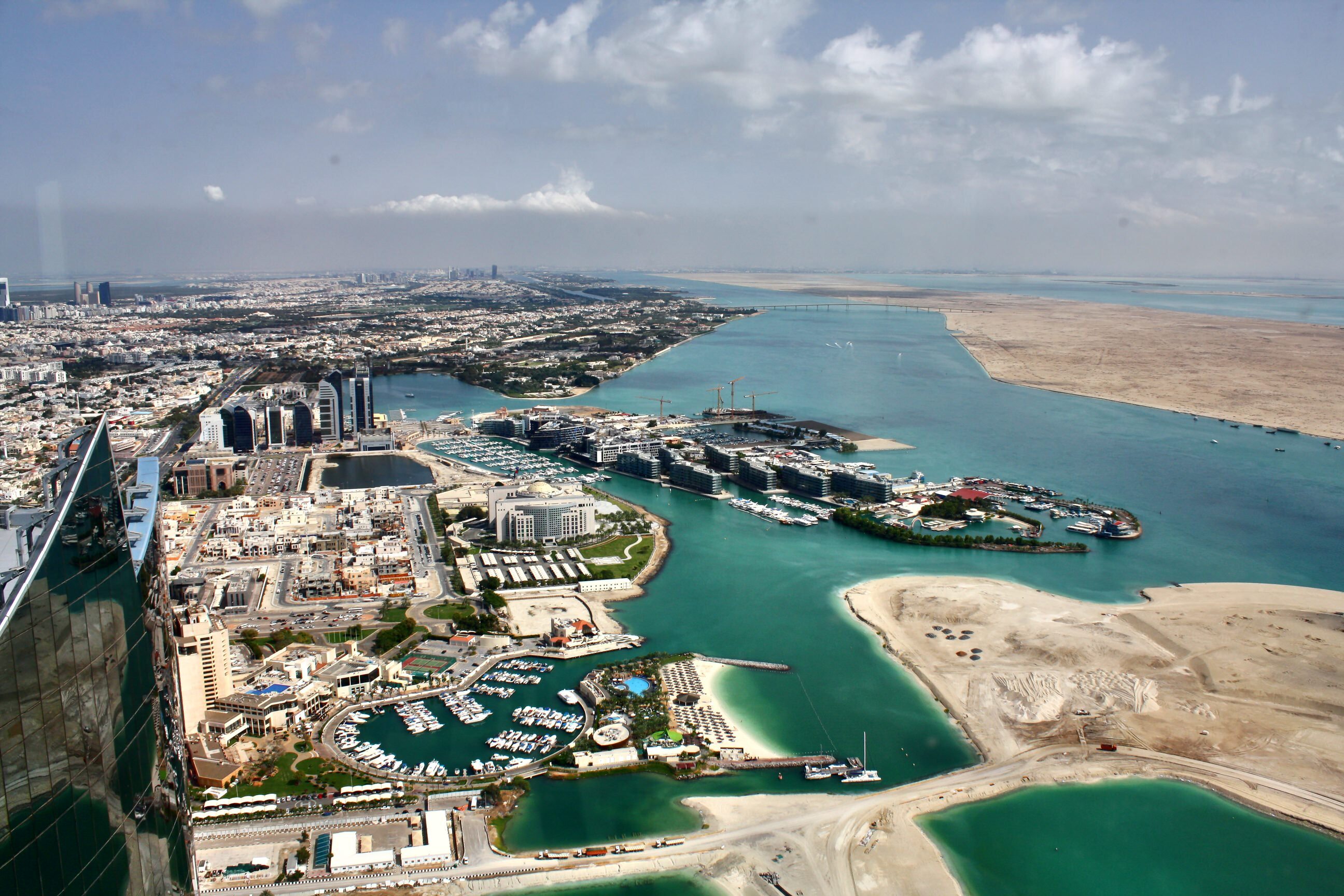 Der Kern der Stadt mit ihren 621.000 Einwohnern befindet sich auf einer 70 Quadratkilometer großen Insel im Persischen Golf, im Mangrovengürtel. Mit dem Festland verbunden ist sie durch die Mussafa-Brücke, die al-Maqtaa-Brücke und die Sheikh-Zayed-Brücke. Die Hauptinsel ist von einem Kranz künstlich erweiterter oder neu aufgespülter Inseln umgeben, die zurzeit erst zum Teil bebaut sind und das Siedlungsgebiet erweitern.
