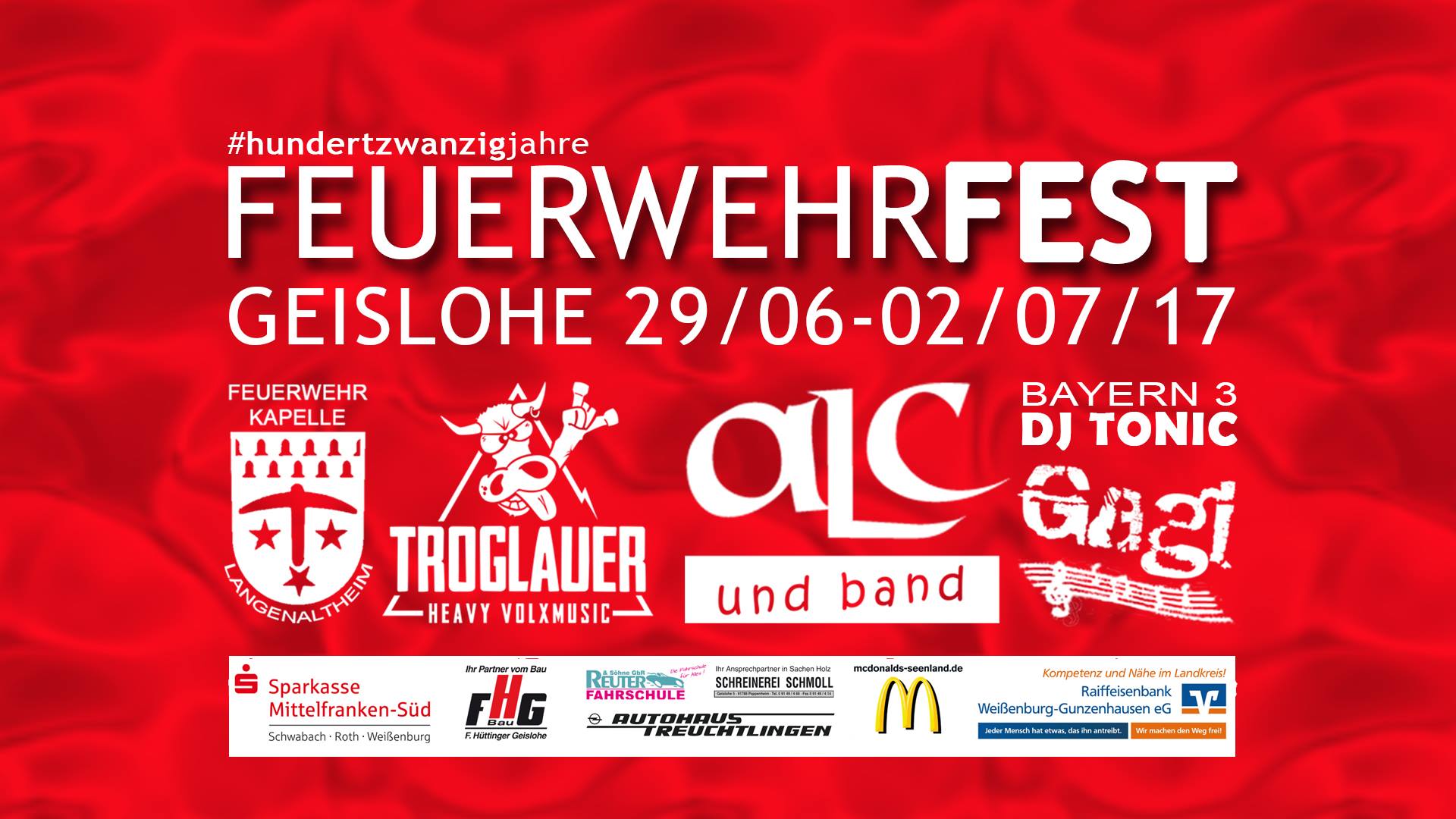 Den Auftakt bildet am Donnerstag (29.06.2017) ein Kameradschaftsabend mit der Feuerwehrkapelle Langenaltheim. Am Freitag (30.06.2017) wird die Treuchtlinger Hip-Hop Formation „ALC und Band“ und anschließend Bayern3 DJ Tonic das Festzelt zum Toben bringen. Der Samstagabend (01.07.2017) wird mit dem Auftritt der funk- und fernsehbekannten „Troglauer Buam“ rockig-traditionell, wenn die "Heavy Volxmusicer" aus der Oberpfalz den Gästen einheizen. Höhepunkt des Jubiläums wird der große Festumzug am Sonntag (02.07.2017). Im Anschluss sorgt der in Geislohe bereits bekannte und beliebte Musiker "Gagi" aus Alesheim für "a Fetz´n Gaudi" und wird dem Fest einen stimmungsvollen Abschluss geben.