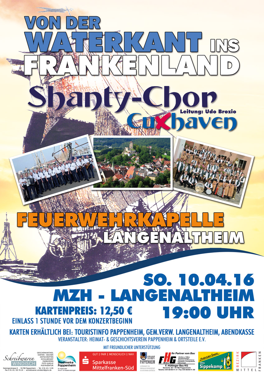Auftakt bildet das Konzert des Shanty-Chor Cuxhaven am 10.04.2016 um 19:00 Uhr in der Mehrzweckhalle Langenaltheim. Dort wird der Deutschlandweit bekannte Shanty-Chor sein Programm mit bekannten Seemannslieder und klassischen Shantys darbringen. Wir werden uns dieser musikalischen Reise von der Waterkant ins Frankenland anschließen und die Highlights unseres Programms spielen. Geplant sind auch einige gemeinsame Stücke aller Musiker.