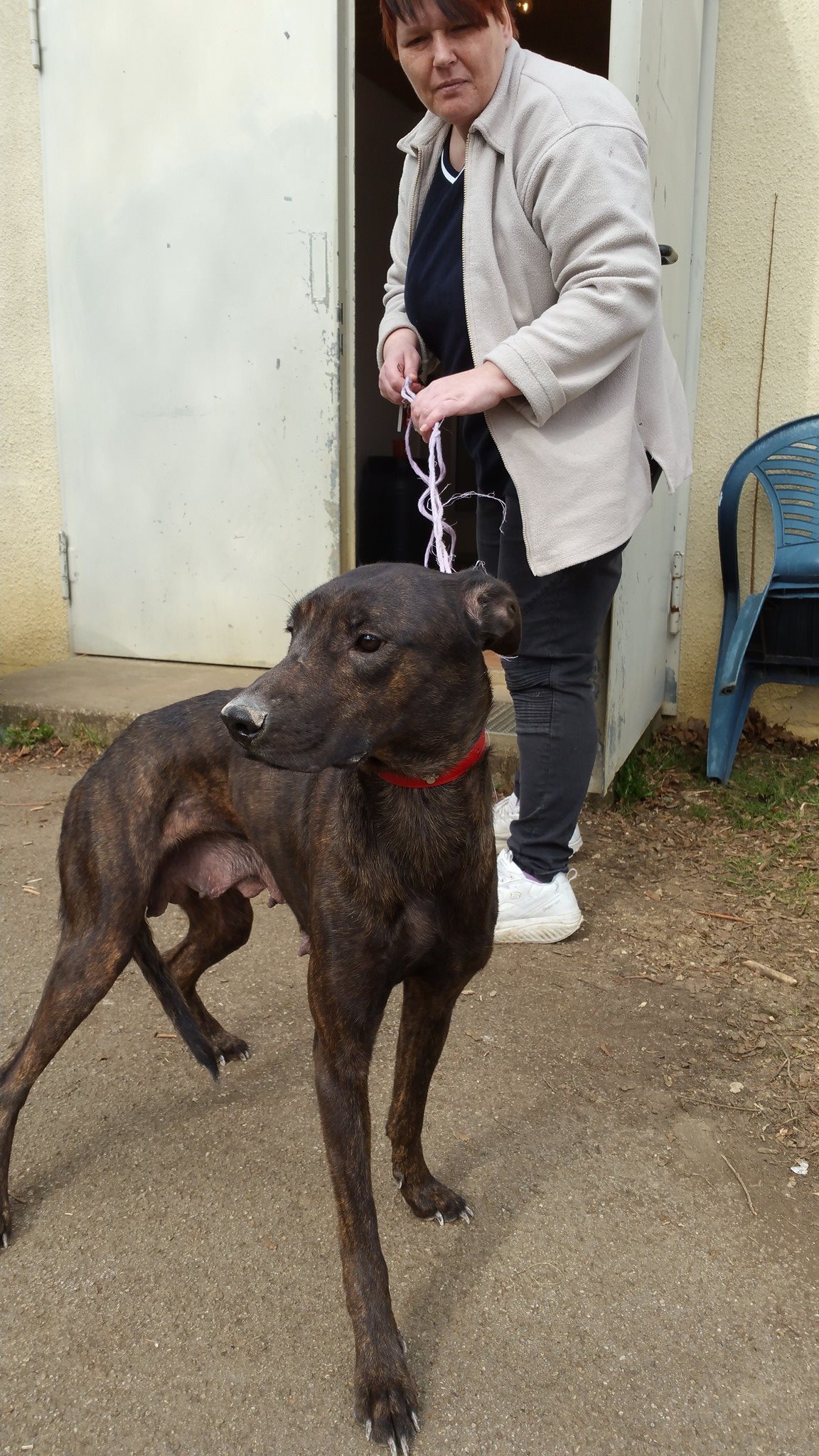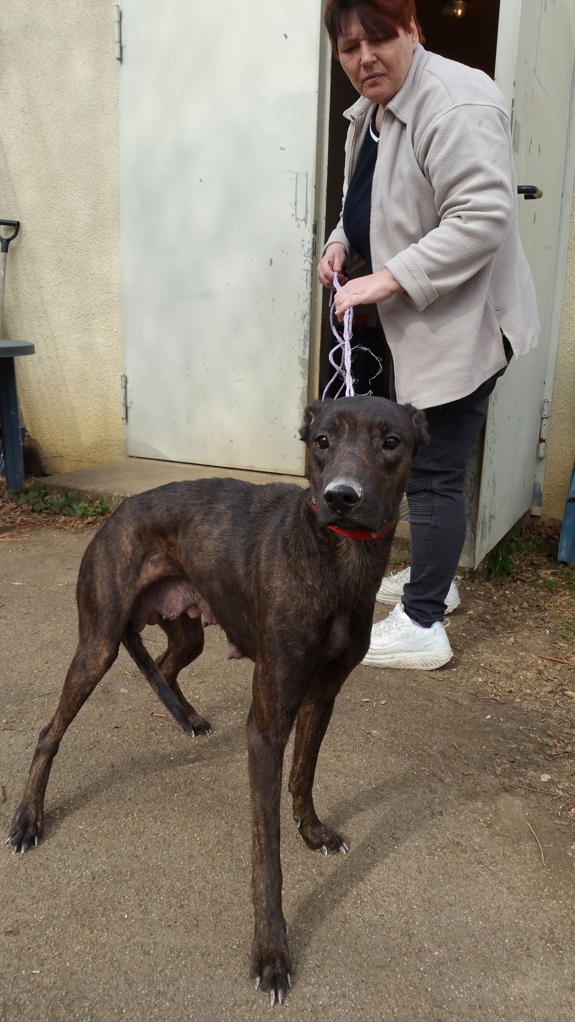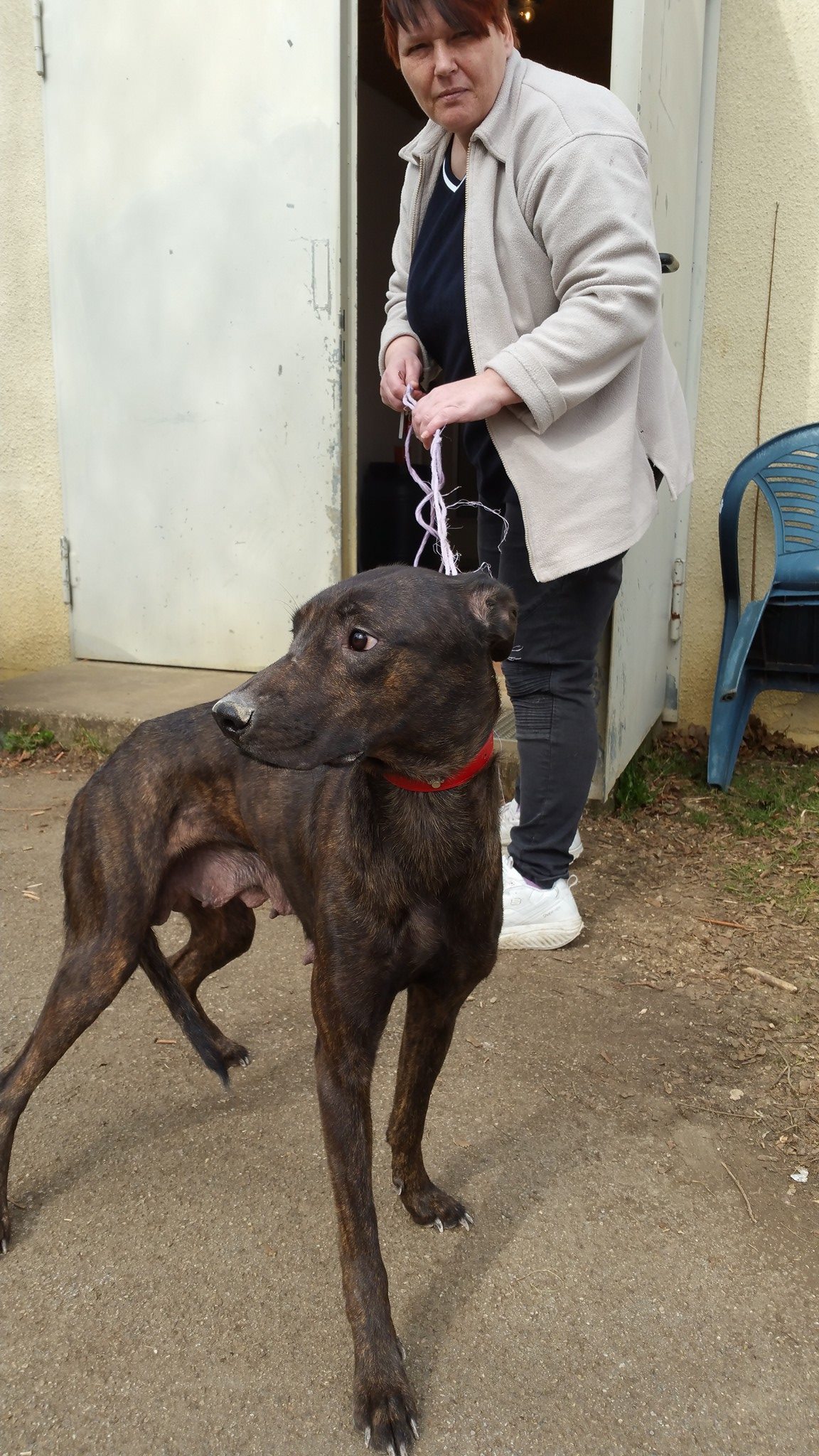 Das Gesäuge weißt darauf hin, dass sie wohl als Zuchthündin gehalten wurde und als sie ausgedient hatte ,einfach entsorgt wurde.