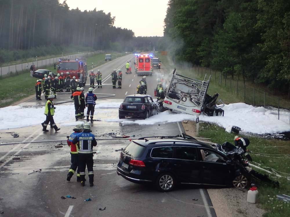 Mehrere Personen wurden bei dem Unfall schwer verletzt. Das Wohnmobil geriet in Brand und wurde durch die Feuerwehren Pleinfeld und Weißenburg gelöscht. Sowohl das Wohnmobil als auch der VW erlitten Totalschaden. Die Bundesstraße 2 war wegen der Aufräumarbeiten zeitweise voll gesperrt.