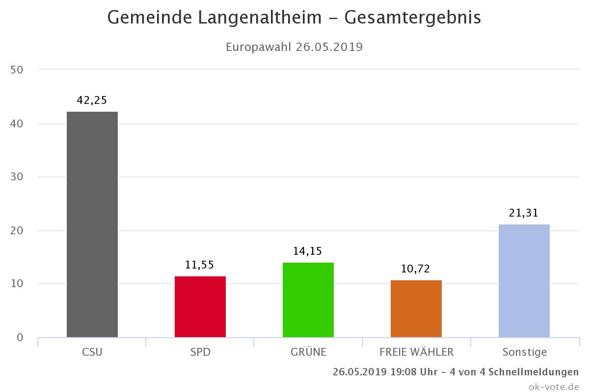 26 Mai Vorläufiges Wahlergebniss der Gemeinde Langenaltheim, zur Europawahl. Bernd Posch 26. Mai 2019 um 20:26 2641 0 Kommentare 1 Die Vorläufigen Ergebnisse zur Europawahl 2019 (Stand: 26.05.2019 - 20:30 Uhr ) …